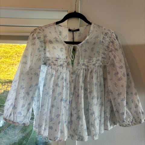Pieces PCJollie bluse for dame i størrelse L. Blusen er beige med små blomstermønster og har lange ermer. Den er laget i bomull og har knappelukking foran samt rynkedetaljer som gir en løs og behagelig passform. Egner seg til hverdagsbruk og kan kombineres med både bukser og skjørt.