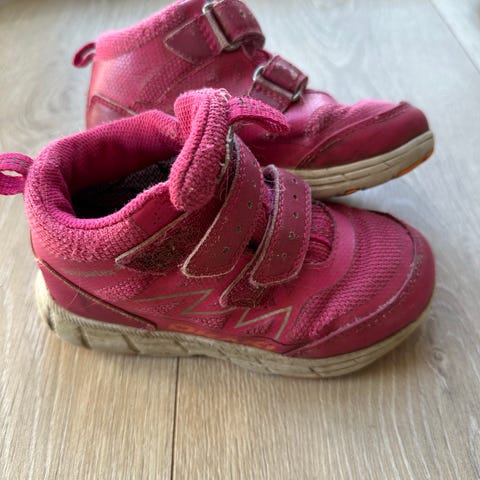 Godt brukte overgangssko fra OKAKI. Kjøpt brukt og brukt av mitt barn. Holder vann unna med sympatex (likner gortex). Knæsj rosa. Ingen hull, men tydelig bruksslitasje (se bilder).