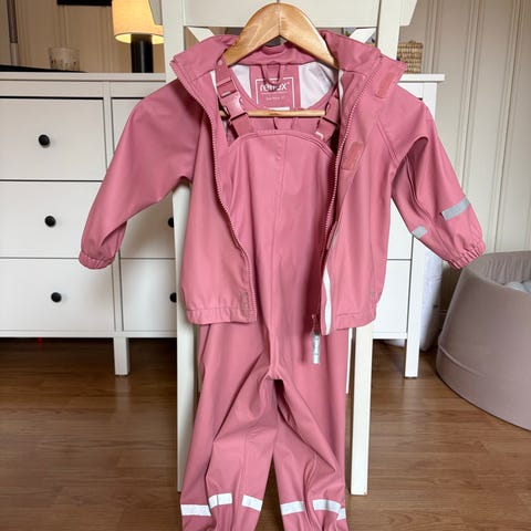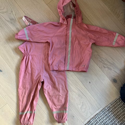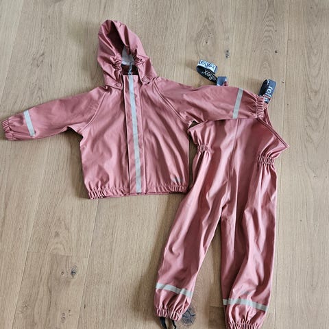 Reflex regntøysett for barn i størrelse 92. Sett med jakke og selebukse i rosa farge. Pent brukt men litt av reflekset på det ene beinet har løsnet litt (se bilde).