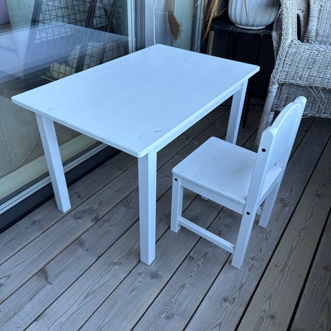 Bord og stol til barn, fra IKEA. Har noen bruksmerker (se bilder) og trenger en vask. Stolen vingler litt, men tror det enkelt kan strammes til med unbraco. Ellers i fin stand :)
