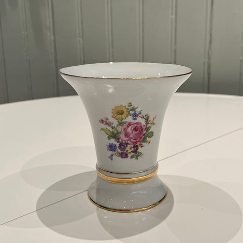 En skjønn liten vase (krukke uten lokk?) fra bestemors samling vil vekk fra skapet der den ble gjemt. Den ønsker seg blomst plukket av små hender som våren snart byr på.