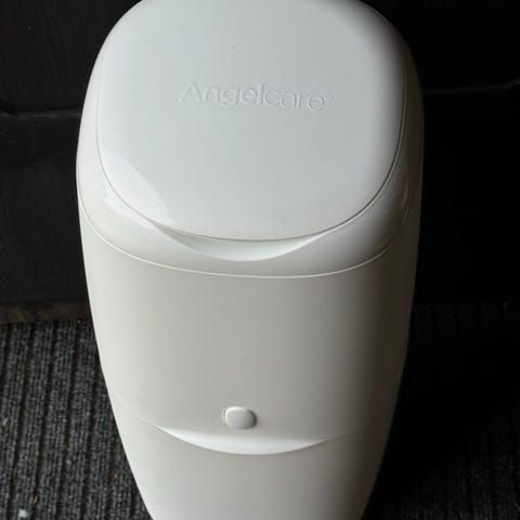 Angelcare bleiebøtte i hvit plast. Fra Barnas hus. Bleiebøtten er beregnet for oppbevaring av brukte bleier og har lokk på toppen. Innsatsen er tilpasset Angelcare-refiller (refiller følger ikke med).