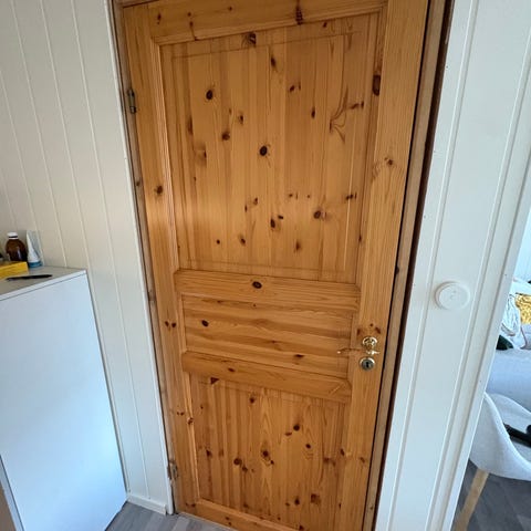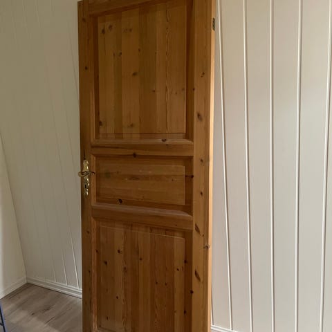 Innendørs dørblad i furu. Døren har klassisk fyllingsdesign og er hengslet på siden. Egner seg til bruk mellom rom innendørs, for eksempel i gang, stue eller bod. Lakket, noen bruksmerker.