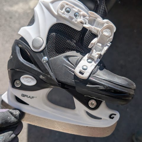 Stuf Ice Skridsko Jr ishockeyskøyter for barn i størrelse 34. Modellen er justerbar og merket for størrelsesområdet 34–37. Skøytene har hard ytterskall med kombinasjon av plast og tekstil for støtte og ventilasjon. Lukking med snøring, borrelåsrem og justerbar spenne gir stabil passform rundt ankelen. Fargekombinasjon hvit, svart og grønn. Egnet til ishockey og generell bruk på is for barn i aktuell skostørrelse.