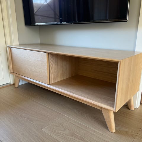 Tv benk fra bohus i lys eik med hvite fronter.