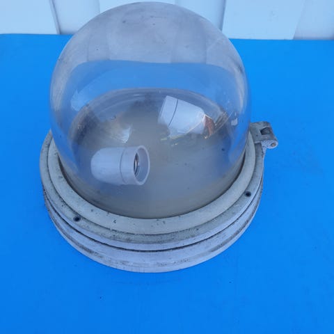 Industriell arbeidslys, lyskaster, taklampe i grått metall. Lampen er kjegleformet med flat skjerm, reflektor på innsiden. Den er utstyrt med opphengsbrakett og elektrisk kabel. Virker/i orden. Egner seg til bruk i garasje, verksted, lager, utendørs, gir god belysning. Må hentes, sendes ikke. Diameter på glass er ca 56,5 cm.