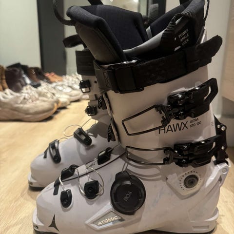 Atomic sto 130 støvel som er stivet opp til en 150 flex. Str 27, måler 95mm i denne str. skallet er ikke gjort noe med, så her kan det tilpasses og justeres som man ønsker. Kommer med 50mm powerstrap. Innsersko er varmetilpasset min fot, men tåler fint noen runder til med tilpasning. Skoen er kun brukt med lifter.
