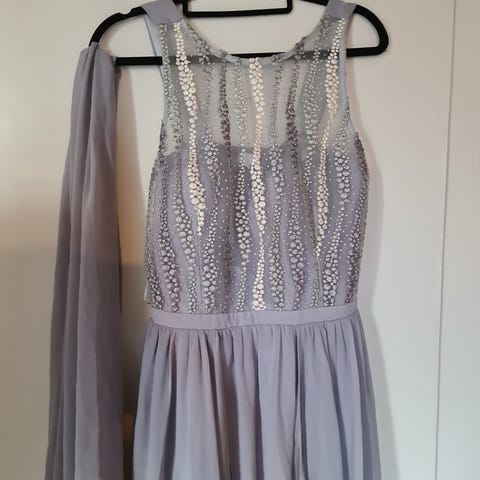Floyd kjole til spesiell anledning for dame i størrelse 14, tilsvarer ca str 40. Lang, grå kjole i polyester med plissert overdel og brede stropper. Midjepartiet har dekor med perler og paljetter. Ryggen har utskjæring øverst og elastisk parti for bedre passform. Egnet til bruk ved formelle anledninger som selskap, bryllup eller andre høytidelige arrangementer.
