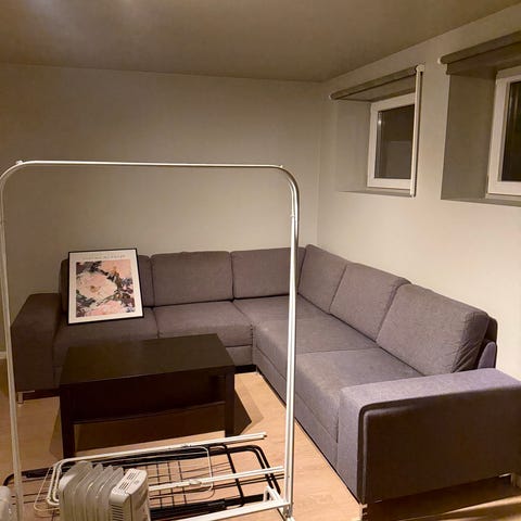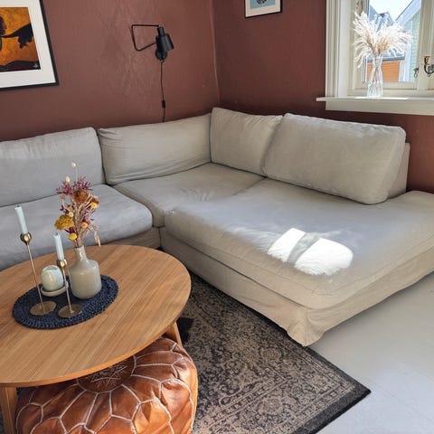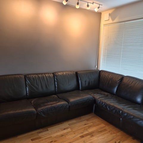 Sofaen deles i tre for transport. En hjørnedel og de to sidene