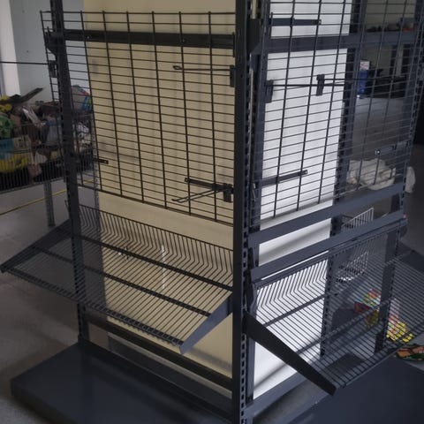 Systemet består av to seksjoner med solide sorte paneler, flere kroker til oppheng og topphyller. Nederst er det også solide baser som gjør systemet stabilt.