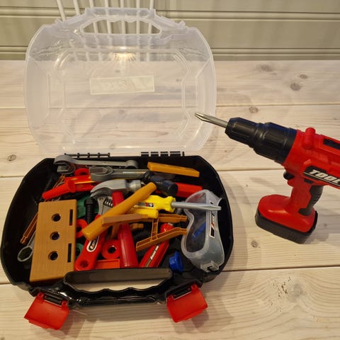 Lekesett med verktøy og hjelm. Settet inneholder blant annet lekekjedesag, håndsag, tang, skiftenøkler, arbeidshansker, vernehjelm og diverse småverktøy. Selges i gjennomsiktig plastkasse. Egnet som rollelek der barn kan late som de sager, skrur og arbeider på en byggeplass eller i verksted.