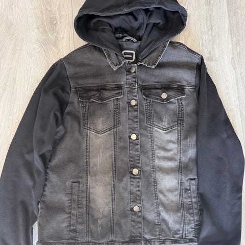 Deminjakke fra Zara, str M. Pent brukt, litt liten i størrelse, så mellom S/M. Hette og armer i stoff. Lett og behagelig å ha på.