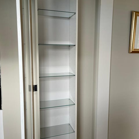 To skap, 165 cm høye pluss litt ramme rundt. For vegghenging. 9 glasshyller i hvert skap.