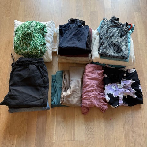 Ulike dameklær i størrelse L. til salgs. Pakken inneholder ulike plagg som bukser, gensere, vester og fleecejakker i flere farger.