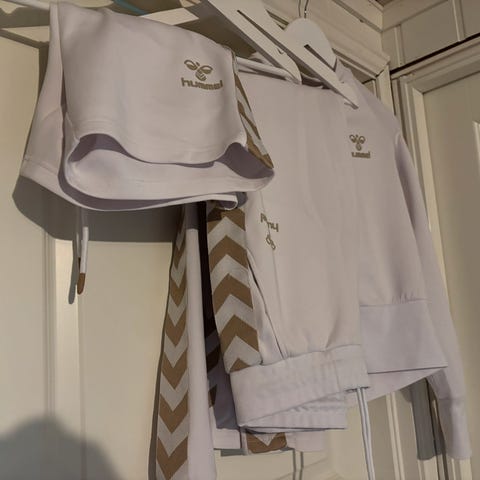 Treningssett for barn i størrelse 122-128, bestående av en kortermet t-skjorte fra Stavanger turnforening og en lang tights fra HM.