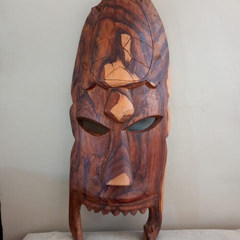 Dekorativ håndlaget veggmaske i glass i flere farger. Masken har abstrakt ansiktsmotiv med tydelige felt i blant annet blått, grønt, gult og rødt. Baksiden viser en tilsvarende sammensetning av fargede glassfelt. Egner seg som veggdekor eller pyntegjenstand i interiør. Lokal kunstner. 26x16 cm