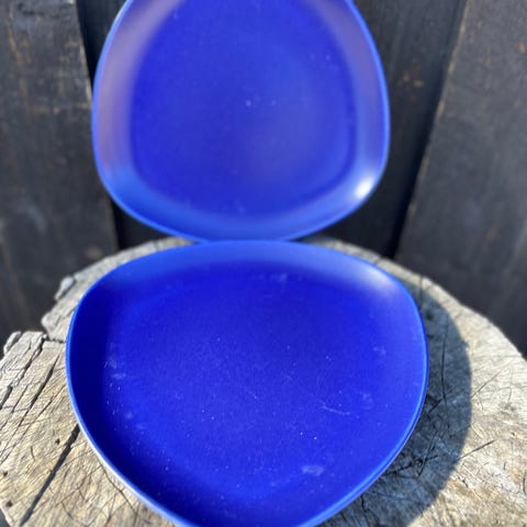 Høganes tallerken i blå farge. Tallerkenen har en trekantet, avrundet form