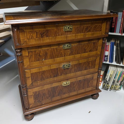 Overflaten i heltre gir et varmt og levende preg, mens de malte skuffene skaper en flott kontrast og et gjennomført design. Det finnes noen bruksmerker som vitner om alder og bruk, men helhetsinntrykket er pent og velholdt.