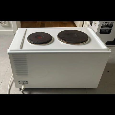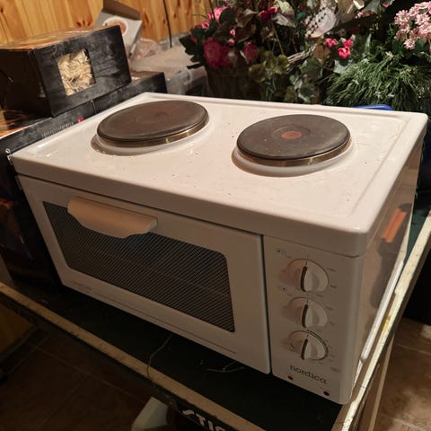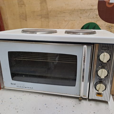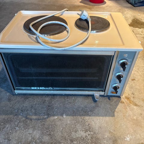 Beha bordkomfyr med to kokeplater på toppen og integrert stekeovn i front. Komfyren har manuelle brytere for temperatur- og plateinnstilling på høyre side. Fronten har glassdør til stekeovnen, og det følger med stekebrett og rist slik det vises på bildene. Egner seg som ekstra komfyr på kjøkken, hybel eller hytte der det er behov for en kompakt løsning med både kokeplater og stekeovn i ett apparat.