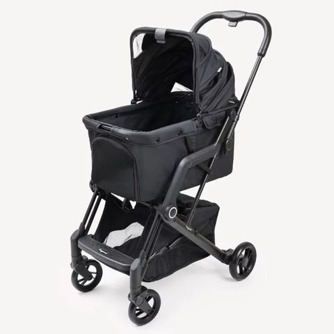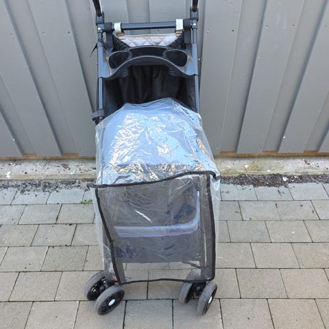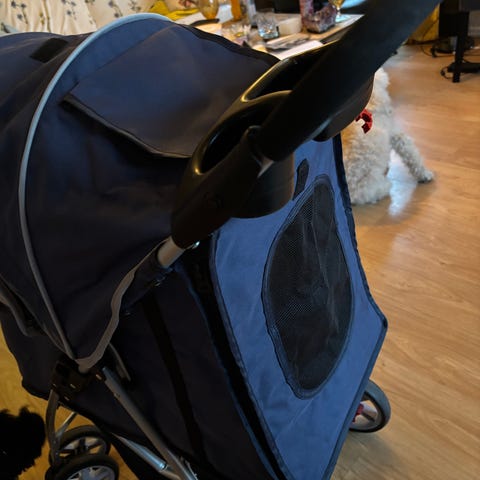 Blå kjæledyrvogn med fire hjul og sammenleggbart design. Vognen har overdel med glidelås og nettingåpning, samt håndtak med koppholdere. Under vognen er det en oppbevaringskurv. Egnet for transport av mindre kjæledyr på tur og i hverdagen.