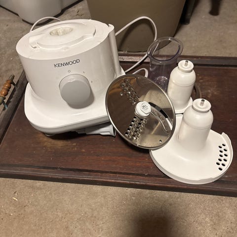 Kenwood Chef kjøkkenmaskin i hvit utførelse. Maskinen leveres med plastbolle og flere tilbehør, inkludert ballongvisp, eltekrok og K-visp/rørevisp. Hastighet og funksjoner styres via dreiehjul på fronten. Egner seg til vanlig kjøkkenbruk som elting av deig, pisking og røring av ulike typer røre og deig.