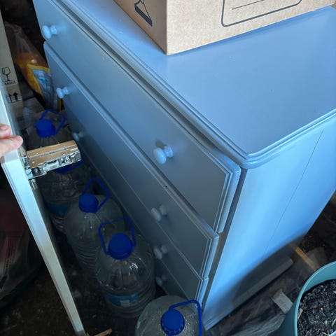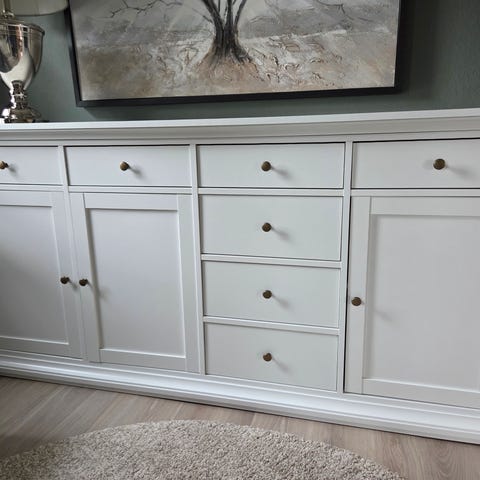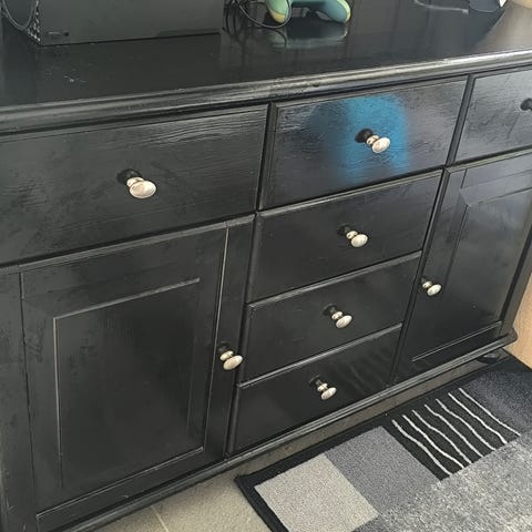 Kommoden i massivt gummitre er stor og meget rommelig. Et lite merke i bakre hjørne kan greit fikses.