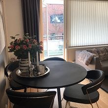 Spisebordet er 120 cm i diameter og det er fint plass til 6 personer rundt bordet. Selges da det ikke passer inn i ny leilighet.