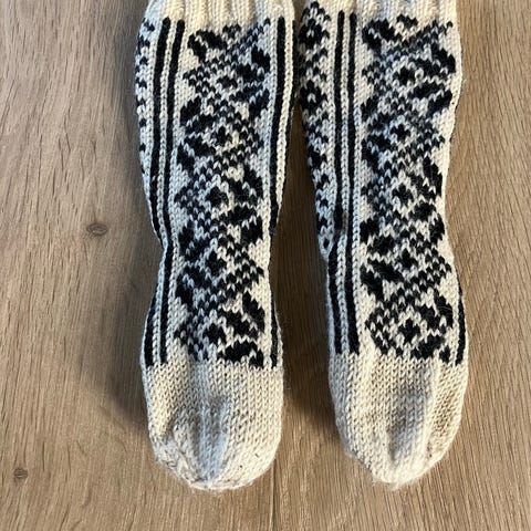 Selger ett par hjemmestrikka ullsokker. Tilsvarer ca. str. 31-34. Ca. 7-10 år.