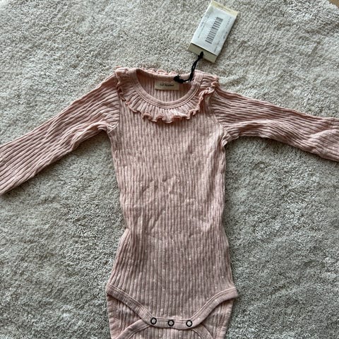 Name it body i størrelse 74. Langermet modell i rosa ribbestrikket modalblanding. Bodyen har rund hals og søte volanger på skuldrene.