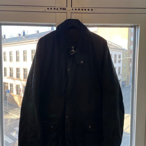 Barbour jakke for herre i størrelse L. Jakken er svart og laget i bomull. Innvendig har den et rødt rutete fôr. Passer som ytterjakke til hverdagsbruk og utendørsaktiviteter. Klassisk Barbour-design med krage og frontlukking med knapper og glidelås avhengig av modell. Materialet krever vedlikehold i tråd med Barbours pleieanvisning på innsiden av jakken.