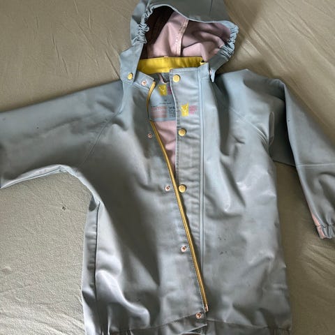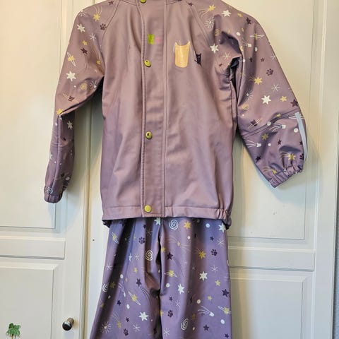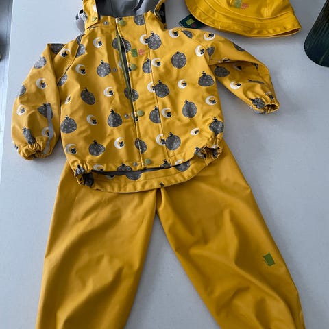 Kattnakken regntøy, pent brukt av 1 barn. Helt og fint, ingen hull. Mangler en knapp til å feste en fotstrikk. Noe misfarge grunnet moro og lek☺️