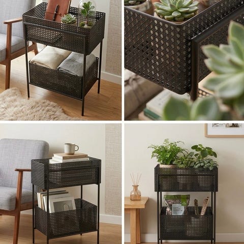 Kan brukes til både planter, bøker og annen pynt.