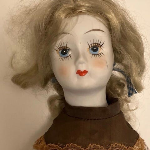 Porselensdukke kledd i brun mønstret kjole med paisleymønster og store sløyfer. Dukken har malt ansikt, hodeplagg med blomsterpynt og gullfarget kjede rundt halsen. Hendene og føttene er i porselen, med gullfargede sko. Egner seg som pyntegjenstand eller samlerobjekt. Fra 1980-90 tallet..