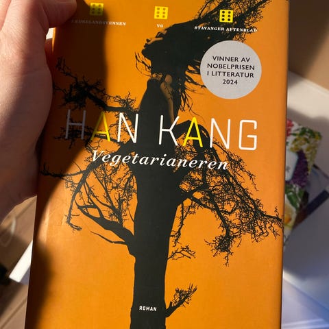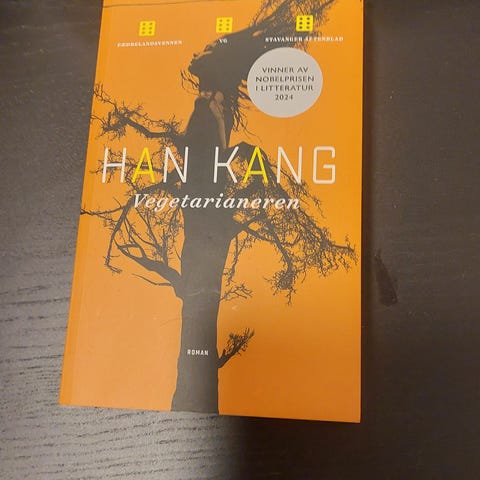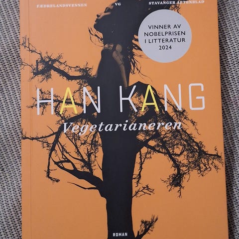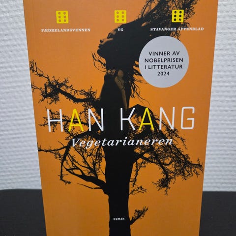 Han Kang Vegetarianeren bok på norsk. Skjønnlitterær roman i norsk oversettelse. Pocketutgave med norsk tekst og omslag i oransje fargetoner. Passer for lesere som ønsker moderne samtidslitteratur oversatt til norsk.