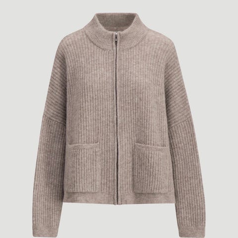 Strikket cardigan i årets nye farge "pale dogwood" (dus rosa). Glidelås, 2 frontlommer og ribbestrikkede mansjetter. Løs passform. 43% ull, 30% alpakka, 23% nylon, 4% elastan.