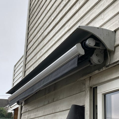 Utvendig markise med stripet duk i grå og hvit. Uviss alder. Gis bort mot nedskruing. Den ene er 160 cm bred, den andre 255 cm.