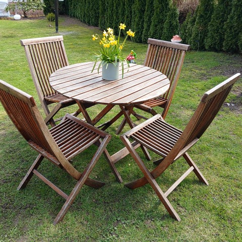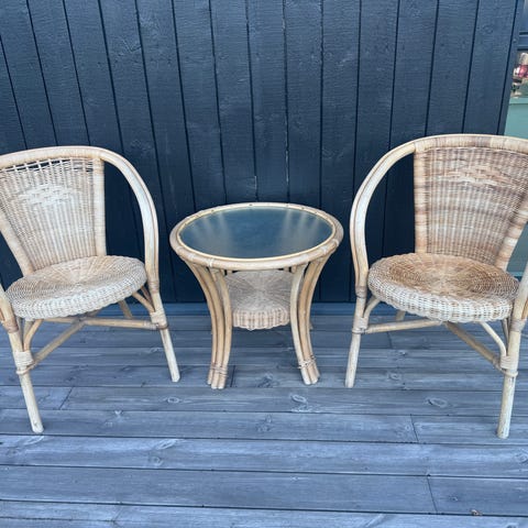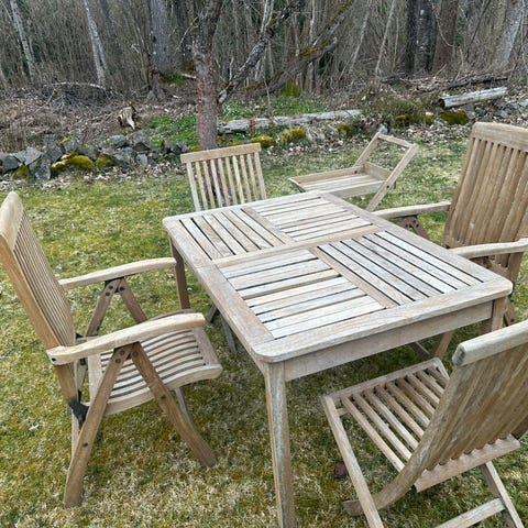 To stoler, ett bord i naturell teak - sammenleggbare.