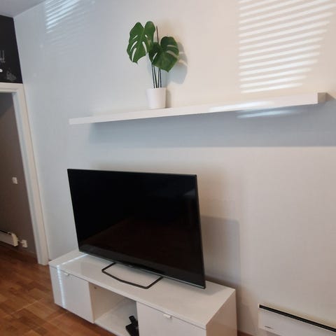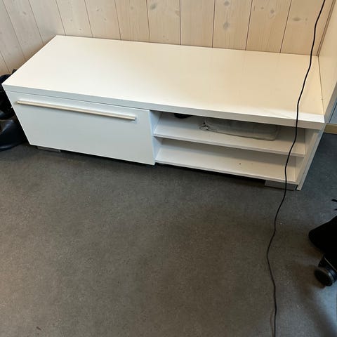 Stor hvit tv-benk med hvit finish. Ganske tung, men jeg kan hjelpe til med å bære ut. Bor i 1. etg. Usikker på merke/produsent.