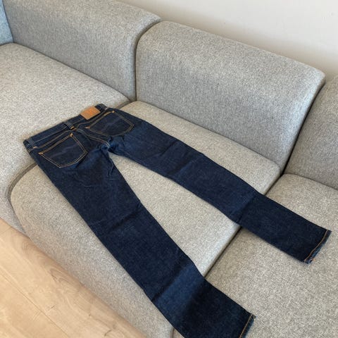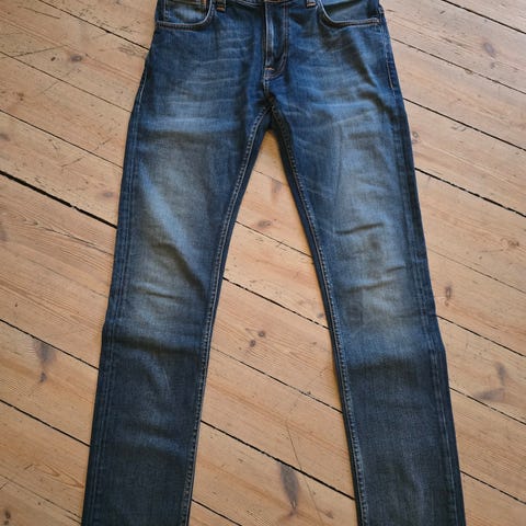 Nudie Jeans jeans i blå denim for herre. Er litt usikker på hvilken størrelse buksene er i men vil gjette at den er i noe rundt w31. Materialet er bomull, som gir et klassisk denimuttrykk. Tradisjonell 5-lommersmodell med kontrastsømmer og karakteristisk baklommebroderi. Passer til hverdagsbruk og kan kombineres med ulike overdeler for et enkelt og tidløst uttrykk