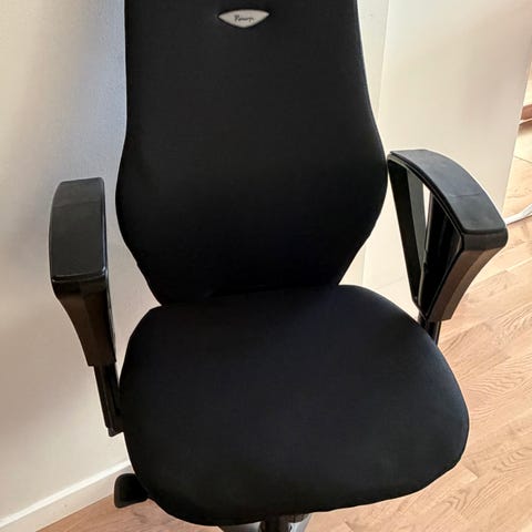 Kinnarps kontor/besøks stol, modell Arcus 686. Bestselger fra Kinnarps, på grunn av god komfort. Armlener i tre. Svart stål ramme. Bildene av stoffet avviker fra originalen. Stoffet er uten sjatteringer. Gi gjerne bud.