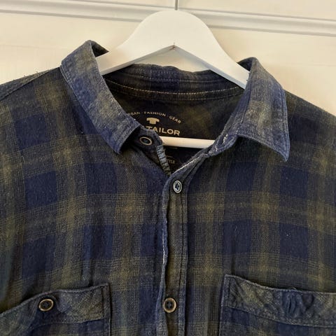 Skjorten er i blå bomull med rutemønster. Ble liggende ubrukt. Fint til fritidsaktiviteter.