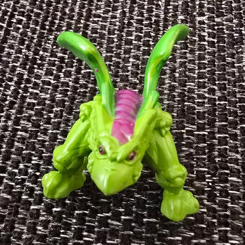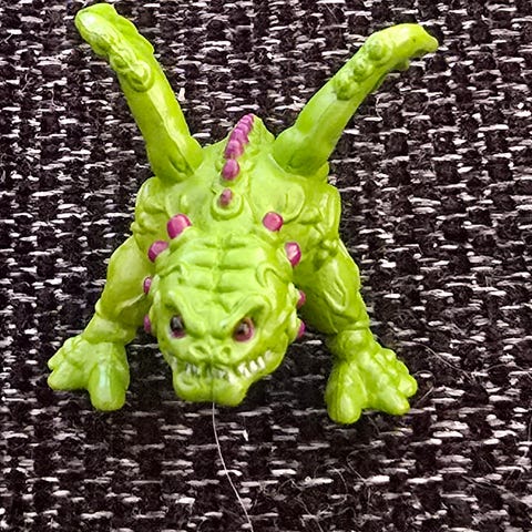 Utseende: Figuren er grønn med en gul, rillet mage og store gule øyne.