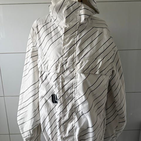 Jakken har hette, glidelåslukking foran og ribbestrikket kant nederst. Den har flere lommer og er merket med Burton-logo på brystet. Farge i blåtoner. Str XL.