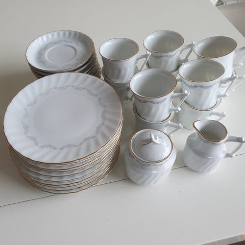 Bogstad kaffeservise i helhvitt til seks personer. Ligger fremdeles i gaveeske og har aldri vært brukt. Ett bitte lite avslag på en asjett (skjedd under transport) - se bilde nr. 4. Selges samlet til 750 kr (som er under prisen for to sett). Bør hentes, men kan ev. sende mot betaling av pakking - 100 kr.
