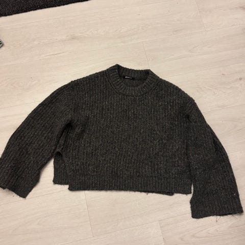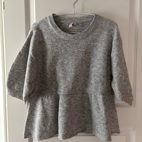 Gina Tricot genser for dame i størrelse S. Genseren er grå og har rund hals, lange ermer og utsvingt kant nederst som gir en peplum-lignende fasong. Mykt, strikket materiale som passer til hverdagsbruk eller enkel pynting. Fargen er jevnt mørk grå med diskré melering.