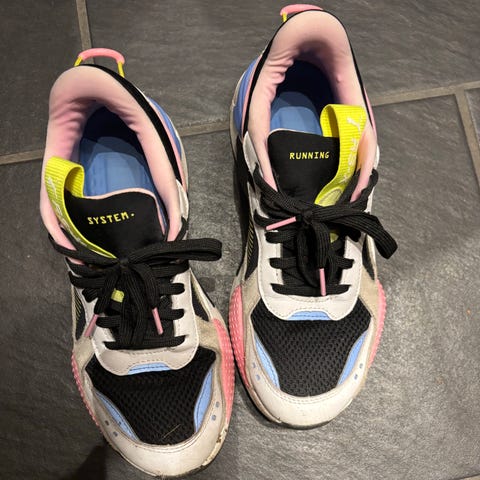 Puma RS-X sneakers i størrelse 40. De ble for små for meg så vil si de passer en 39. Joggeskoene har overdel i tekstil og syntetisk materiale i beige og lyse toner, med snøring foran. Sålen er kraftig og gir god støtte til hverdagsbruk og lett aktivitet. Nøytral farge som passer til ulike antrekk.