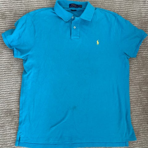 Ralph Lauren Polo piqueskjorte for herre i størrelse XL. Skjorten er blå og laget av 100 % bomull. Klassisk poloskjorte med krage, knappestolpe med to knapper og kort erm. Passer til hverdagsbruk og fritid. Basert på merkelapp og materiale fremstår dette som en standard Polo Ralph Lauren piqueskjorte i bomull.
