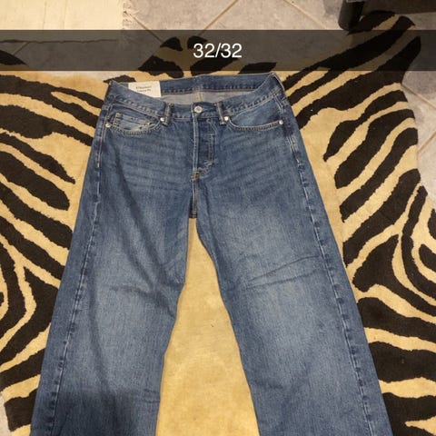 Buksene er i en klassisk blå denim farge, med en naturlig «slitt look» fra fabrikk. De fremstår begge i hel, ren og pen stand.
