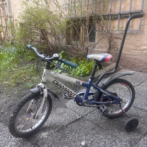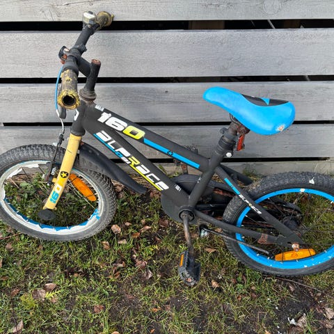 White AR 160 Comp barnesykkel med 16" hjul. Sykkelen har blå ramme med grønne detaljer og grønne felger. Utstyrt med sete og styre tilpasset barn. Egnet som første eller tidlig barnesykkel for korte turer og lekesykling på asfalt og grus.