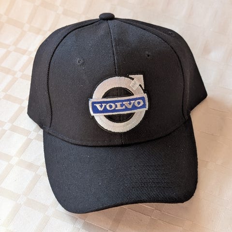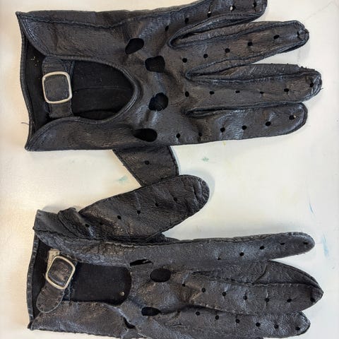 Volvo kjørehansker i lysgrått skinn, mener dette skal være geiteskinn, veldig mykt. Hanskene har perforeringer på oversiden og innsiden for bedre ventilasjon, samt åpning og borrelåslukking ved håndleddet med Volvo-logo.